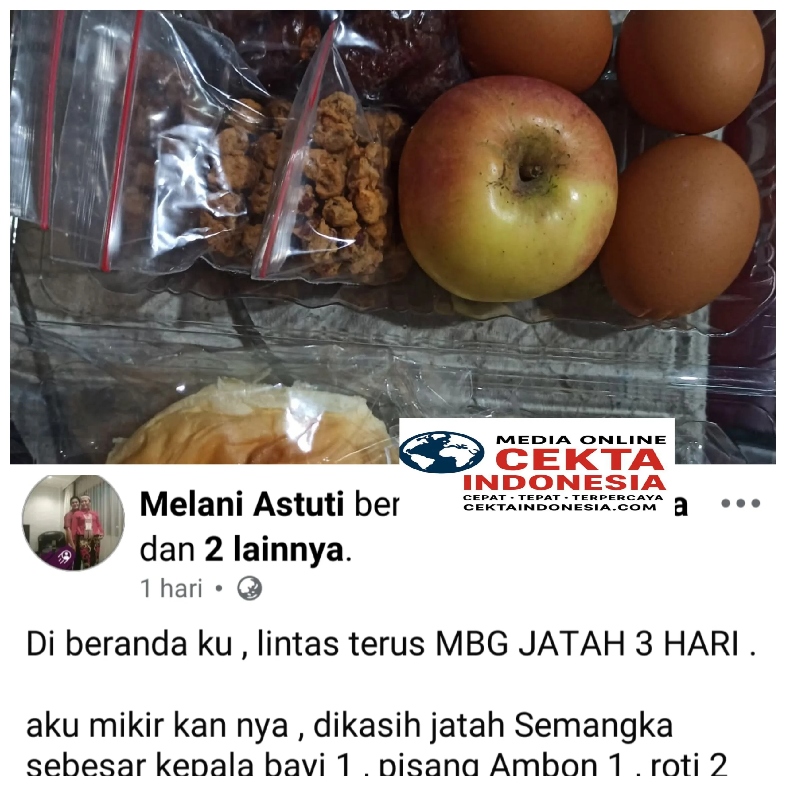 Dalam unggahan tersebut, Melani mempertanyakan kelayakan paket MBG yang disebut sebagai “jatah tiga hari”, berisi semangka, pisang Ambon, roti, dan telur rebus. Ia menyoroti aspek keamanan pangan, ketahanan makanan, serta masa simpan, terutama jika paket tersebut benar-benar dikonsumsi selama tiga hari,Rabu (25/02/2026)