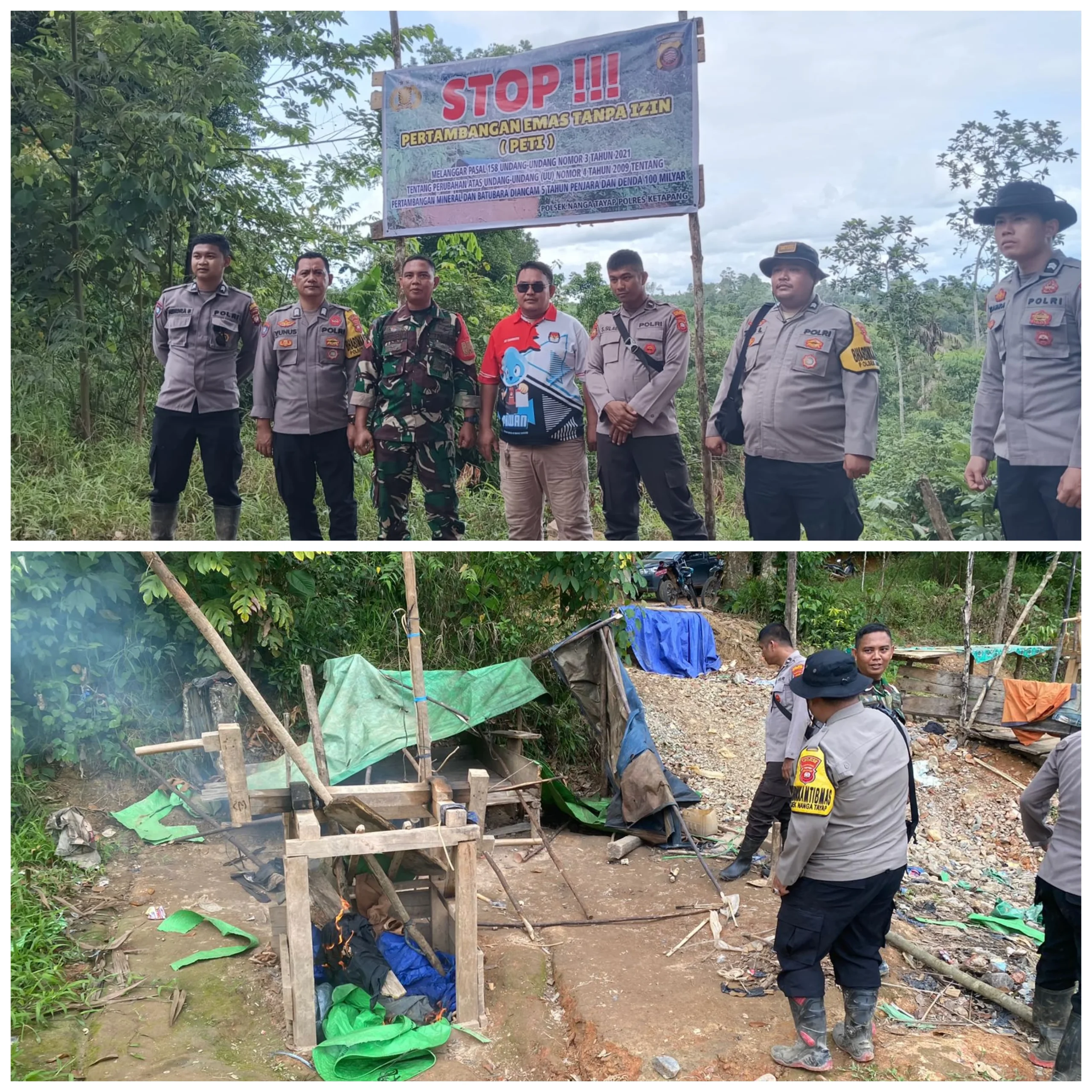 Petugas gabungan menemukan beberapa pekerja masih bekerja menggali lubang untuk ditambang menggunakan alat manual dan beberapa mesin solar. Petugas Polsek Nanga Tayap langsung mendatakan para pekerja dan menghimbau untuk segera menghentikan kegiatan serta diberikan penjelasan mengenai larangan menambang secara liar. Selanjutnya para pekerja diarahkan petugas untuk segera kembali pulang ke desa. Mesin solar yang ditinggalkan para pekerja pun diamankan petugas untuk dimusnahkan.